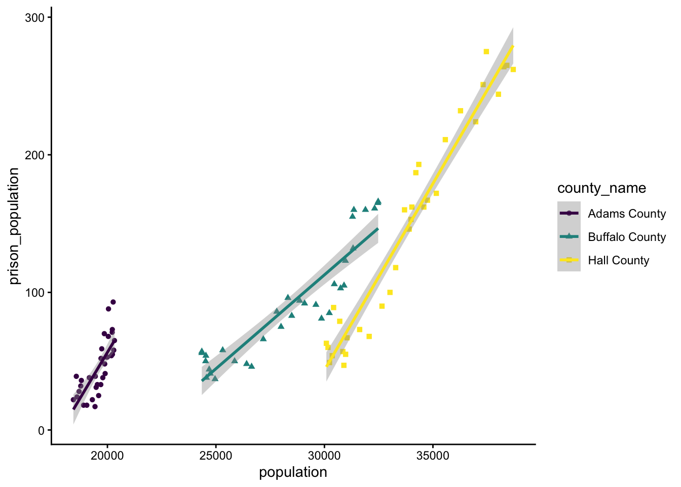 ## This takes a while to loadprison <-read_csv("https://raw.githubusercontent.com/rfordatascience/tidytuesday/main/data/2019/2019-01-22/prison_population.csv") |>filter(state =="NE"& pop_category =="Total") |>filter(county_name %in%c("Buffalo County", "Hall County", "Adams County")) |> dplyr::select(year, county_name, population, prison_population) |>na.omit()