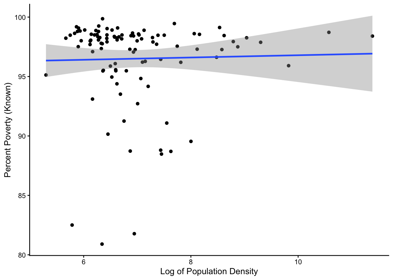 You have heard that many cities and urban areas are worse off than rural areas, but as someone who has talked to people from rural and urban areas, you are not sure if that’s true. You decide to compare the total poverty rate for different counties (percpovertyknown) to the log of the population density (popdensity) in each county in Illinois, home to many rural farm counties as well as some of the largest cities in the country.