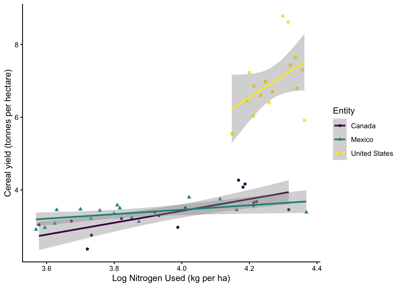 You want to see just how effective fertilizer is at increasing crop yields. You decide to compare nitrogen fertilizer use to cereal yield (in tonnes per acre) in the Canada, Mexico, and the United States. You wanted to see (1) what overall trends exist in the overall dataset and (2) whether slopes are different between different countries.