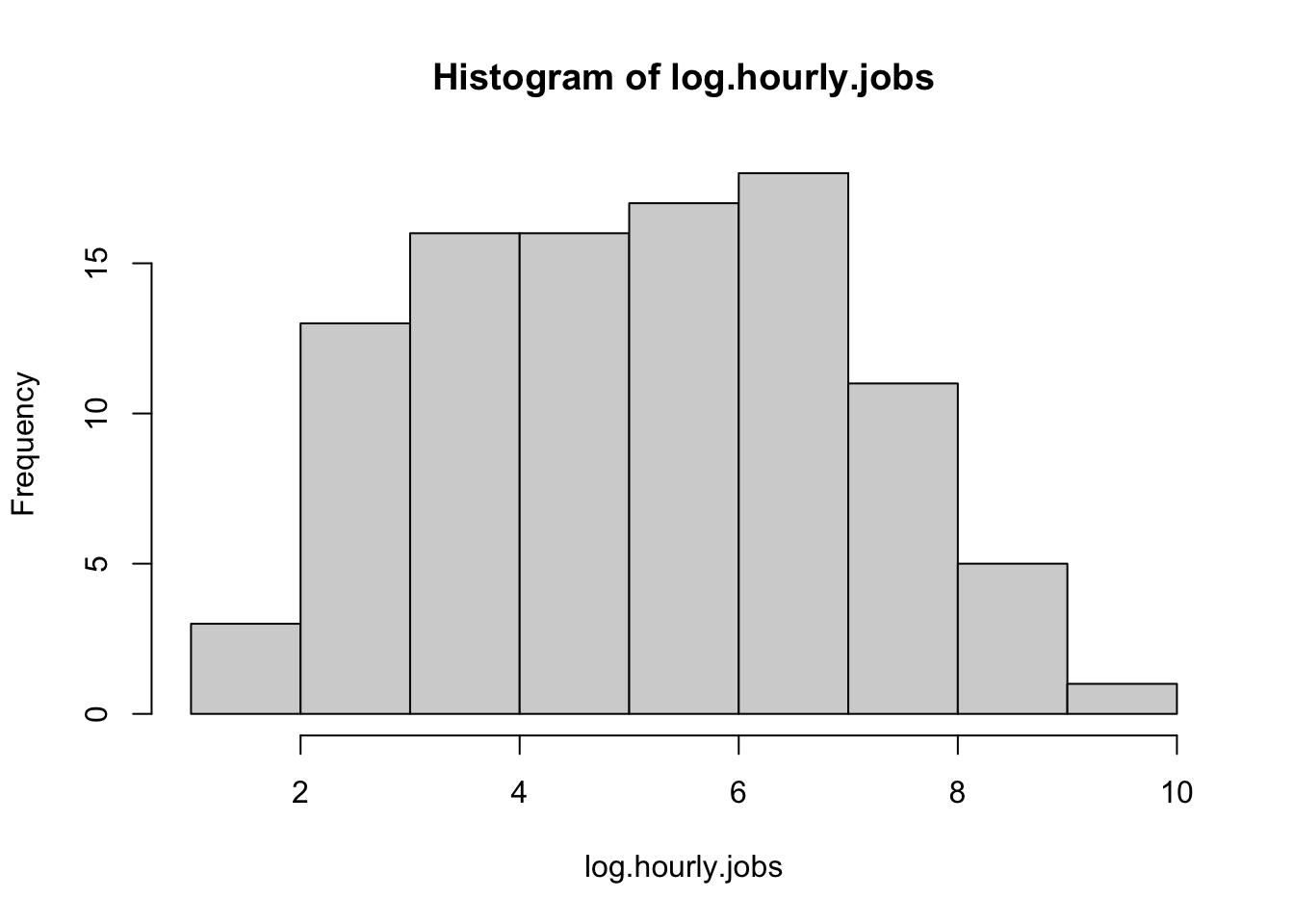 We know that our hourly.jobs dataset is non-normally distributed, so we need to perform a transformation to see if we can achieve normality. Here, we will perform a log transformation. In R, the function log performs a natural log (\(ln\)) by default. Because \(ln(0)\) is \(-Infinity\), folks will often add \(+1\) to their entire dataset to avoid zero values. We can do this by using the command log1p, which has the back-transformation of expm1.