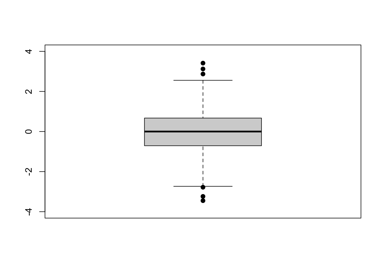 We can also create boxplots to visualize the spread of the data. Boxplots include a bar for the median, a box representing the interquartile range between the 25th and 75th percentiles, and whiskers that extend \(1.5 \cdot IQR\) beyond the 25th and 75th percentiles. We can create a boxplot using the command boxplot.