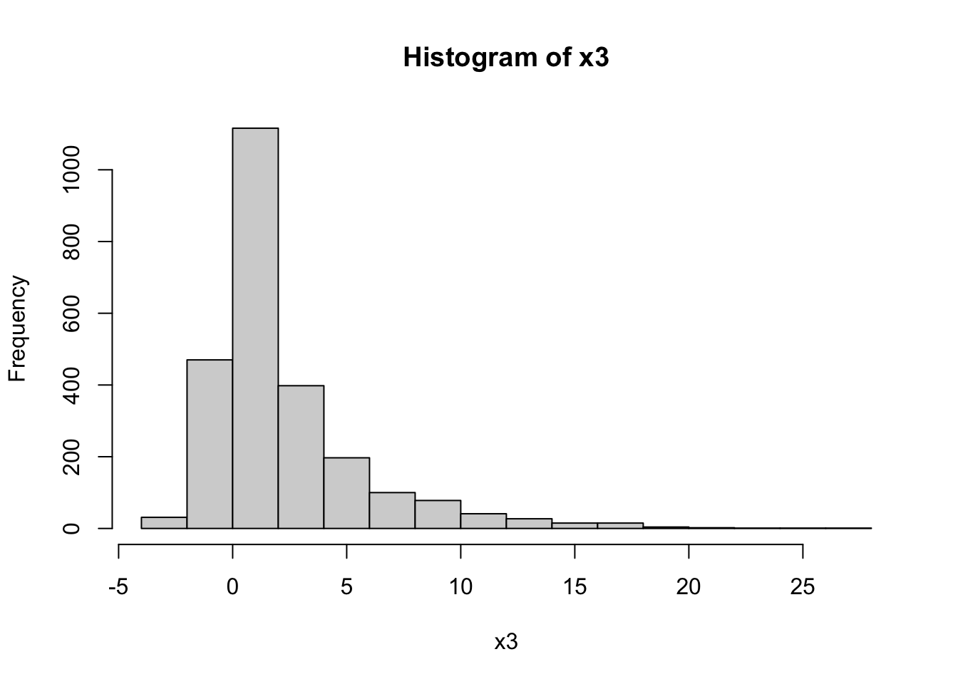 Let’s look at a skewed dataset. We are going to artificially create a skewed dataset from our x vector.